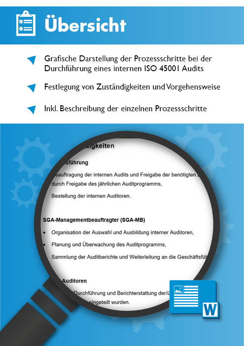 Ein internes Audit ISO 45001 hilft Ihnen dabei, die Wirksamkeit Ihres Arbeitsschutzmanagement Systems zu überwachen, eventuelle Verbesserungspotenziale zu identifizieren und aus diesen Erkenntnissen Maßnahmen für die kontinuierliche Verbesserung des Managementsystems ableiten zu können. Nutzen Sie die Prozessbeschreibung Vorlage, um ein internes Arbeitsschutzmanagement Audit erfolgreich durchzuführen. Die Prozessbeschreibung ISO 45001 umschreibt dabei ausführlich die Verantwortlichkeiten sowie die Vorgehensweise für ein internes Audit gem. ISO 45001.